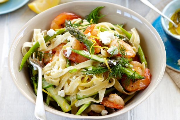 Meanwhile, heat oil in a frying pan over high heat. Cook prawns for 3-4 mins or until prawns change colour. Add the asparagus and garlic and cook, stirring, for 2-3 mins or until just tender. Add to the hot fettuccine with the horseradish cream and half the cheese, the reserved marinade and half the lemon zest. Toss to combine, adding enough of the reserved cooking liquid to coat.