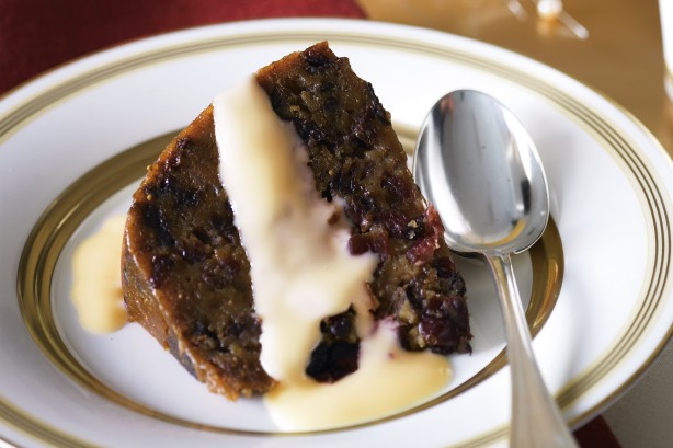 Place an upturned heatproof saucer in the base of a large saucepan. Fill one-third of the pan with boiling water. Bring to a simmer over low heat. Use the handle to lower the basin onto the saucer in the pan. Add enough boiling water to reach two-thirds of the way up the sides of the basin. Cover the pan with a tight-fitting lid and simmer, adding more water when necessary, for 2 1/2 hours or until a skewer inserted in the centre of pudding comes out clean (see tip 4).